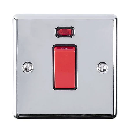 The Revive 45 Amp Switch with Neon Power Indicator features raised rounded edge, designed to give a contemporary look. Made from high quality materials, this accessory is styled in a modern design and has a Polished Chrome finish.