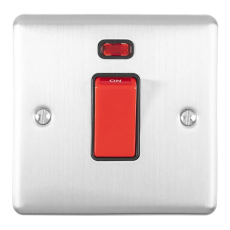 The Revive 45 Amp Switch with Neon Power Indicator features raised rounded edge, designed to give a contemporary look. Made from high quality materials, this accessory is styled in a modern design and has a satin stainless steel finish.