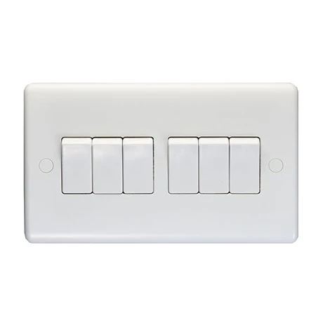 The Revive 6 Gang 2 Way Light Switch features rounded edges for a contemporary look. Made from high quality materials, this accessory is styled in a modern design and has an White finish.