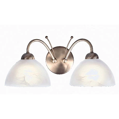 A contemporary antique brass wall light with a lavish circular wall plate and two gently curved arms that support two decorative alabaster glass shades. Finished in traditional antique brass, you’ll be hard-pressed to find 2 light wall lights quite as extravagant as this.