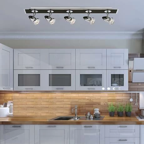 A sleek and stylish black ceiling light, this Revive fitting is an ideal option for those who desire a refined look. With 5 adjustable chrome and black spotlights, you’ll have no trouble illuminating every corner of a kitchen or dining area.