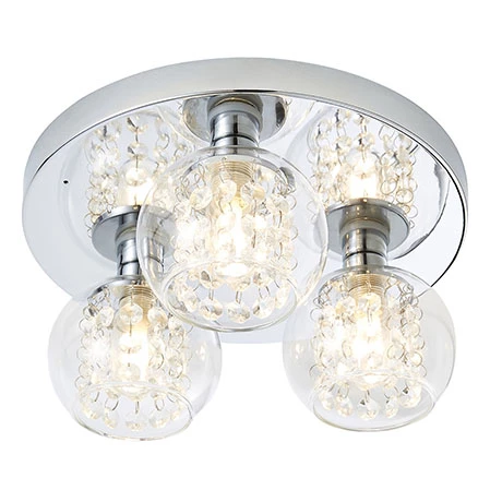 The Revive 3-light flush bathroom ceiling light is a stylish and contemporary bathroom light. It features a polished chrome ceiling plate and three clear glass shades with decorative crystal glass droplets. The light takes 3 x G9 LED lamps for ease of replacement. Its IP44 rating makes it suitable for use in the bathroom.