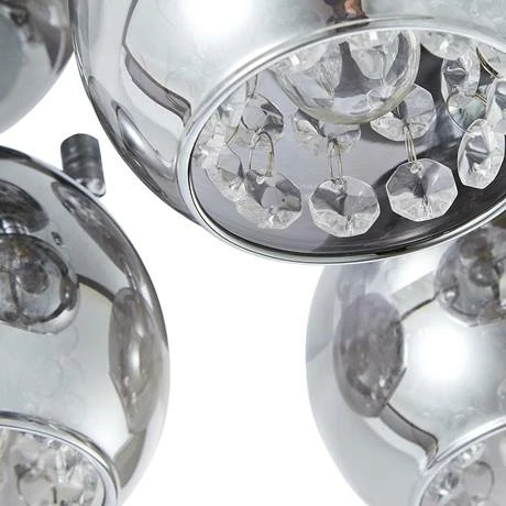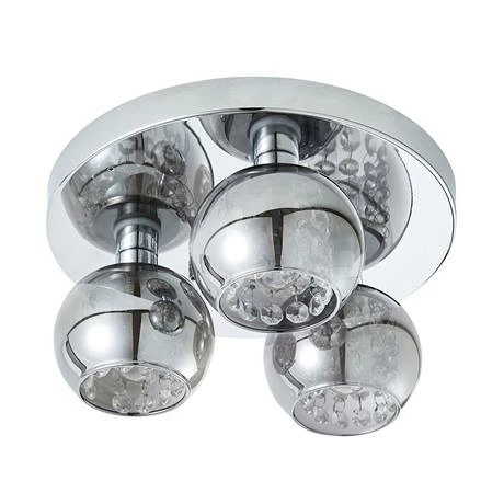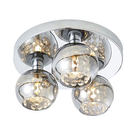 The Revive 3-light flush bathroom ceiling light is a stylish and contemporary bathroom light. It features a polished chrome ceiling plate and three smoked glass shades with decorative crystal glass droplets. The light takes 3 x G9 LED lamps for ease of replacement. Its IP44 rating makes it suitable for use in the bathroom.