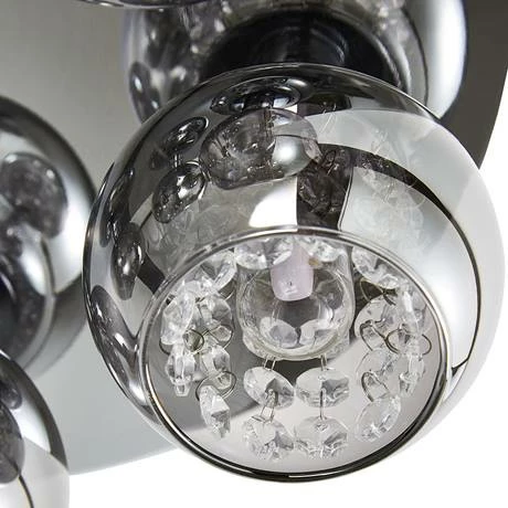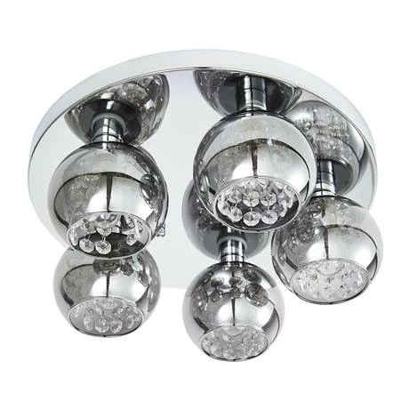 The Revive 5-light flush bathroom ceiling light is a stylish and contemporary bathroom light. It features a polished chrome ceiling plate and five smoked glass shades with decorative crystal glass droplets. The light takes 5 x G9 LED lamps for ease of replacement. Its IP44 rating makes it suitable for use in the bathroom.
