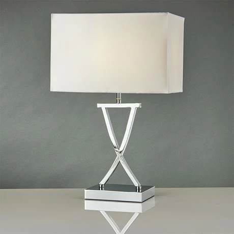 This ultra-modern chrome table lamp is a surefire choice for those looking to heighten the look of a contemporary space. The lamp’s striking yet understated ‘crossed’ design is combined brilliantly with a clean white rectangular shade.