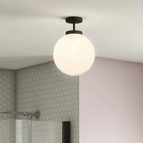 The Revive 1 light semi-flush bathroom ceiling light is a stylish light fitting ideal for the modern bathroom. It features a matt black effect round ceiling plate and a globe opal glass shade mounted on a matt black arm.