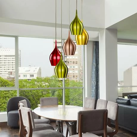 Consider coloured glass pendant lights to create a chic, sophisticated look in your home’s kitchen and dining areas. This Revive multi-coloured pendant light boasts 5 eye-catching aluminium shades that hang elegantly from braided cables at varying heights.