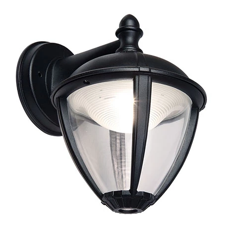 This outdoor matt black wall mounted lantern gives off a warm white light and creates a cozy and traditional look. The LED latern is constructed from heavy duty die-cast aluminium with a transparent impact proof polycarbonate diffusor.