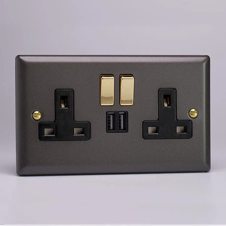 The Revive Twin Plug Socket with USB features bevelled edges for a contemporary look. Made from high quality materials, this accessory is styled in a modern design and has a Slate Grey Finish.